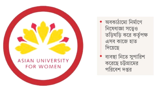 চট্টগ্রামে অবস্থিত এশিয়ান ইউনিভার্সিটি ফর উইমেন অনুমতি ছাড়াই পাহাড় কেটে খেলার মাঠসহ অবকাঠামো তৈরি করছে। এমনকি ৬০ ফুট উচ্চতার পাহাড় কেটে স্পোর্টস কমপ্লেক্স নির্মাণের পরিকল্পনা করছে বিশ্ববিদ্যালয়টি। বন্দর নগরীর বায়েজিদ লিঙ্ক রোড এলাকায় অবস্থিত বিশ্ববিদ্যালয়টি প্রাকৃতিক জলাভূমিও ভরাট করছে। অবকাঠামো নির্মাণে নিষেধাজ্ঞা সত্ত্বেও অন্তর্বর্তীকালীন সরকার দায়িত্ব গ্রহণের পর তড়িঘড়ি করে বিশ্ববিদ্যালয় কর্তৃপক্ষ এসব কাজে হাত দিয়েছে।