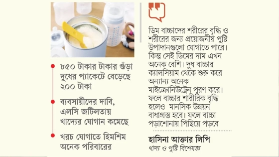 চট্টগ্রামের খাদ্য ও পুষ্টি বিশেষজ্ঞ হাসিনা আক্তার লিপি জানান, কর্তৃপক্ষকে শিশুখাদ্যের মূল্য নিয়ন্ত্রণে রাখতে উদ্যোগ নিতে হবে। তা না হলে পুষ্টি পরিস্থিতির ওপর দীর্ঘমেয়াদি প্রভাব পড়বে। ডিম একটা ফার্স্ট ক্লাস প্রোটিন, যা বাচ্চাদের প্রয়োজনীয় পুষ্টি জোগাতে পারে। কিন্তু সেই ডিমের দাম এখন অনেক বেশি। দুধ বাচ্চাদের একটি প্রয়োজনীয় খাবার। বাচ্চার ক্যালসিয়াম থেকে শুরু করে অন্য অনেক মাইক্রোনিউট্রিয়েন্ট পূরণ করে দুধ। এর অভাবে বাচ্চার শারীরিক বৃদ্ধি হলেও মানসিক উন্নয়ন বাধাগ্রস্ত হবে। বাচ্চা বড় হলেও ঠিকমতো কাজ করতে পারবে না, পড়াশোনায় পিছিয়ে পড়বে।