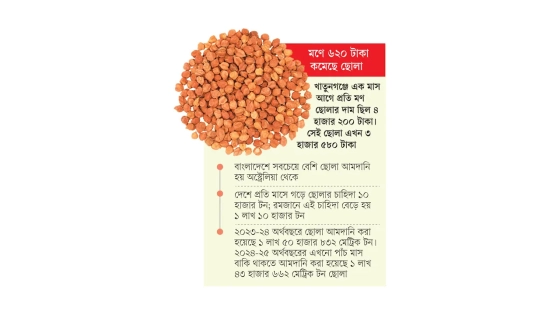 খাতুনগঞ্জের পাইকারি বাজারে এক মাস আগে প্রতি মণ ছোলার দাম ছিল ৪ হাজার ২০০ টাকা। সেই ছোলা এখন বিক্রি হচ্ছে ৩ হাজার ৫৮০ থেকে ৬০০ টাকায়। এ হিসাবে মণে কমেছে ৬০০ থেকে ৬২০ টাকা। আর কেজিতে কমেছে ১৩ থেকে ১৬ টাকার মতো। দাম কমার পরও ছোলার সরবরাহ বাড়ছে। তাই আসন্ন রমজানে ছোলার দাম নিম্নমুখী থাকবে, আশা করছেন পাইকারি মোকামের ব্যবসায়ীরা।