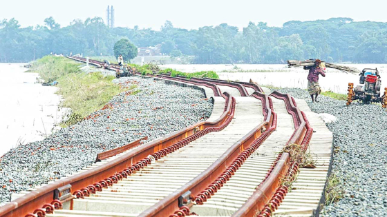 অতি তাপদাহের কারণে কিছুদিন আগে দেশের বিভিন্ন অঞ্চলে রেললাইন বেঁকে যাওয়ার ঘটনা ঘটে। এবারের ঘটনা ঠিক বিপরীত। বানের পানিতে বাঁকা হলো রেললাইন। নির্মাণাধীন দোহাজারী-কক্সবাজার রেলপথের সাতকানিয়া উপজেলার কেঁওচিয়া ইউনিয়নের তেমুহনী এলাকাসহ কয়েকটি স্থানে ক্ষতিগ্রস্ত হয়েছে লাইন।