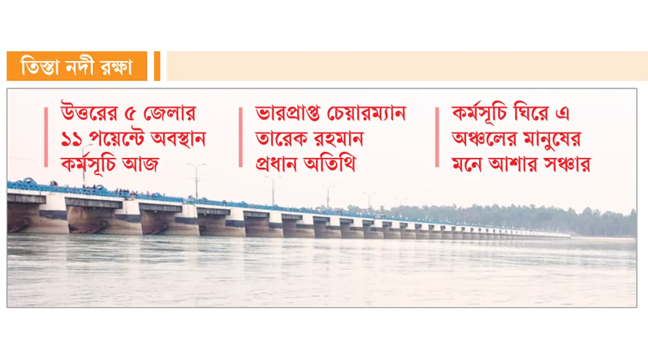 উত্তরাঞ্চলের মানুষের দীর্ঘদিনের দাবি তিস্তার পানির ন্যায্য হিস্যা ও মহাপরিকল্পনা বাস্তবায়ন নিয়ে আন্দোলনের মাঠে বিএনপি। পটপরিবর্তনের পর এ দাবিতে নানা কর্মসূচি পালন করে আসছে ‘তিস্তা নদী রক্ষা আন্দোলন’ নামের একটি সংগঠন। প্রধান সমন্বয়কারী হিসেবে সংগঠনটির হাল ধরেছেন বিএনপির সাংগঠনিক সম্পাদক আসাদুল হাবিব দুলু। এবার তিস্তা বাঁচাতে নদীপাড়ের ১১ পয়েন্টে দুদিনের লাগাতার অবস্থান কর্মসূচি ঘিরে আশা দেখছেন এ অঞ্চলের মানুষ। আজ সোমবার তিস্তার লালমনিরহাট প্রান্তে ‘জাগো বাহে, তিস্তা বাঁচাই’-স্লোগানে এ কর্মসূচির উদ্বোধন করবেন বিএনপির মহাসচিব মির্জা ফখরুল ইসলাম আলমগীর। এতে ভার্চুয়ালি প্রধান অতিথির বক্তব্য দেবেন বিএনপির ভারপ্রাপ্ত চেয়ারম্যান তারেক রহমান। এ ছাড়া কর্মসূচিতে অংশ নেবেন দলের মহাসচিবসহ শীর্ষ ১৪ নেতা। তিস্তাবেষ্টিত বিভাগের পাঁচ জেলা রংপুর, লালমনিরহাট, নীলফামারী, কুড়িগ্রাম ও গাইবান্ধার ১১টি পয়েন্টে এ অবস্থান কর্মসূচি পালন করা হবে। এদিকে কর্মসূচির ঠিক দুদিন আগে আকস্মিকভাবে তিস্তার ধু ধু বালুচরে উজানের পানি এলেও তা ২৪ ঘণ্টার মধ্যে কমে যায়। এর আগে গত শনিবার বিকেল ৪টার পর থেকে তিস্তা ব্যারাজ পয়েন্টে পানিপ্রবাহ বাড়তে শুরু করে।