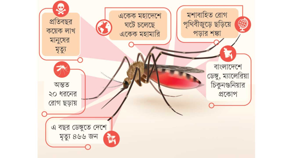 ছোট্ট একটি প্রাণী মশা। যার কাছে অসহায় গোটা বিশ্ব। মশাবাহিত রোগের প্রকোপে দেশে দেশে অতিষ্ঠ জনজীবন। কীটপতঙ্গের আক্রমণে প্রতিবছর যত মানুষ মারা যান, তার মধ্যে মশাবাহিত রোগে সর্বোচ্চসংখ্যক মানুষের মৃত্যু হয়। মার্কিন যুক্তরাষ্ট্রের সেন্টার ফর ডিজিজ কন্ট্রোল অ্যান্ড প্রিভেনশন মশাকে বিশ্বের সবচেয়ে মারাত্মক প্রাণী বলে অভিহিত করেছে। প্রতিষ্ঠানটি জানিয়েছে, মশাবাহিত রোগে প্রতিবছর বিশ্বে প্রায় ৭ লাখ মানুষ প্রাণ হারান। মশাবাহিত রোগের সঙ্গে যুদ্ধ করে আরও কয়েক কোটি মানুষ। বাংলাদেশেও ম্যালেরিয়া, ডেঙ্গু, চিকুনগুনিয়াসহ অন্যান্য মশাবাহিত রোগে প্রতিবছর অসংখ্য মানুষের প্রাণহানি ঘটে। কীটতত্ত্ববিদদের মতে, পৃথিবীতে প্রায় সাড়ে ৩ হাজার প্রজাতির মশা রয়েছে। এর মধ্যে মাত্র ১০০ প্রজাতি রোগ ছড়ায়। গবেষণায় দেখা গেছে, মশা ২০টির মতো রোগ ছড়ায়। তার মধ্যে সবচেয়ে বেশি মৃত্যু ঘটে ম্যালেরিয়া, ডেঙ্গু, ইয়োলো ফিভার, জিকা, ফাইলেরিয়া, চিকুনগুনিয়া ও জাপানিজ এনসেফালাইটিস রোগে।