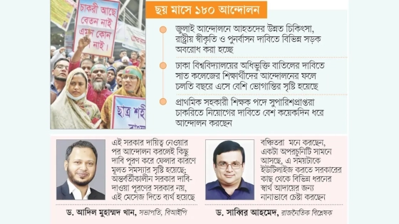 গত বছরের ৮ আগস্ট অধ্যাপক মুহাম্মদ ইউনূসের নেতৃত্বে অন্তর্বর্তী সরকার দায়িত্ব নেওয়ার সময় আইনশৃঙ্খলা পরিস্থিতি ছিল একবারে নাজুক। বিপর্যস্ত অবস্থায় দায়িত্ব নিয়ে অন্তর্বর্তী সরকার যখন কিছুটা গুছিয়ে ওঠার চেষ্টা শুরু করে, তখন একের পর এক যৌক্তিক-অযৌক্তিক আন্দোলন শুরু হয়। বাড়তে থাকে সরকারের ওপর নানা চাপ। এ পরিস্থিতি এখনো আছে। কারও দাবি চাকরি স্থায়ীকরণ, কেউ চান সরকারীকরণ। বদলি নিয়োগ ও বিশ্ববিদ্যালয়সহ নানা ইস্যুতে আন্দোলন। এমএলএসএস থেকে শুরু করে বাদ যাননি ক্যাডার সার্ভিসের কর্মকর্তারাও। অটোরিকশা থেকে অটোপাস, আনসার থেকে পুলিশ। বিসিএস থেকে বিডিআর কিংবা শ্রমিক; আন্দোলন যেন থামছেই না।