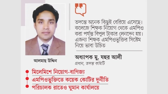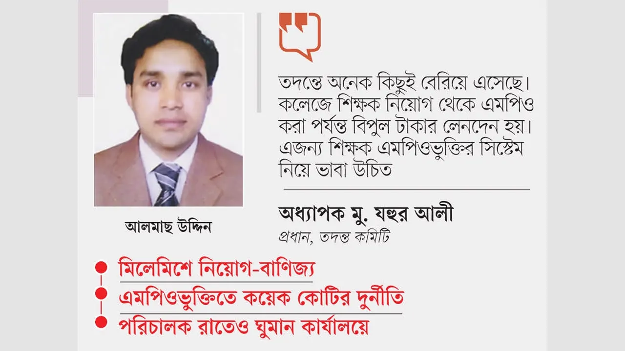তদন্তের মুখে আলমাছ: টাকার বিনিময়ে এমপিওভুক্তিসহ নানা কাজ করে দেওয়ার নামে মাউশির রাজশাহী আঞ্চলিক কার্যালয়ের তৎকালীন পরিচালক (কলেজ) ড. বিশ্বজিৎ ব্যানার্জি, সহকারী পরিচালক (কলেজ) আলমাছ উদ্দিন, সেকেন্ডারি এডুকেশন সেক্টর ইমপ্রুভমেন্ট প্রজেক্ট (সেসিপ) প্রকল্পের গবেষণা কর্মকর্তা মানিক চন্দ্র প্রামাণিক, সহকারী পরিদর্শক আসমত আলী ও রাশেদুল ইসলামের বিরুদ্ধে ঘুষ নেওয়ার অভিযোগ উঠলে গত ৮ জানুয়ারি রাজশাহী কলেজ অধ্যক্ষ অধ্যাপক মু. যহুর আলীকে প্রধান করে তিন সদস্যের তদন্ত কমিটি করা হয়। কমিটি এরই মধ্যে তদন্তকাজ সম্পন্ন করেছে। এখন চলছে প্রতিবেদন তৈরির কাজ।