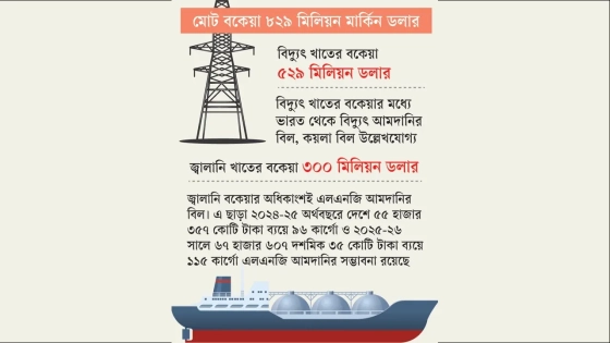 সংশ্লিষ্ট কর্মকর্তারা জানান, বিদ্যুৎ ও জ্বালানি খাতের মোট বকেয়া ৮২৯ মিলিয়ন মার্কিন ডলারের মধ্যে বিদ্যুৎ খাতের বকেয়া ৫২৯ মিলিয়ন ডলার। আর জ্বালানি খাতের বকেয়া ৩০০ মিলিয়ন ডলার। বিদ্যুৎ খাতের বকেয়ার মধ্যে ভারত থেকে বিদ্যুৎ আমদানির বিল, কয়লা বিল উল্লেখযোগ্য। আর জ্বালানি খাতের মোট বকেয়ার অধিকাংশই এলএনজি আমদানির বিল।