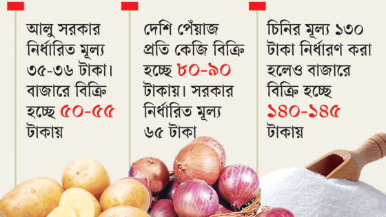 গতকাল সোমবার রাজধানীর বিভিন্ন বাজার ঘুরে প্রতি কেজি আলু ৫০ থেকে ৫৫ টাকায় বিক্রি হতে দেখা গেছে। একইভাবে প্রতি হালি ডিম ৫০ থেকে ৫২ টাকা এবং দেশি পেঁয়াজ প্রতি কেজি বিক্রি হয়েছে ৮০ থেকে ৯০ টাকায়। এক মাসেরও বেশি সময় আগে খোলা চিনির কেজি ১৩০ টাকা নির্ধারণ করা হলেও বাজারে এখন তা ১৪০ থেকে ১৪৫ টাকায় বিক্রি হচ্ছে। এ নিয়ে খুচরা ব্যবসায়ীদের সঙ্গে বাগবিতণ্ডায় জড়িয়ে পড়ছেন সাধারণ ক্রেতারা।