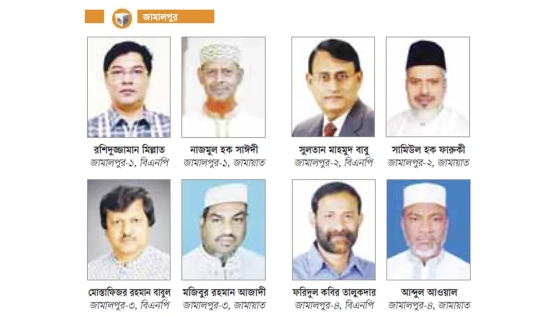 জামালপুর-১: দেওয়ানগঞ্জ ও বকশীগঞ্জ উপজেলা নিয়ে গঠিত আসনটিতে বিএনপির প্রার্থী এম রশিদুজ্জামান মিল্লাত। তার সঙ্গে ত্রিমুখী লড়াই হতে পারে জামায়াতে ইসলামীর নাজমুল হক সাঈদী ও ইসলামী আন্দোলনের প্রার্থী সাবেক উপজেলা চেয়ারম্যান বহিষ্কৃত বিএনপি নেতা আব্দুর রউফ তালুকদারের সঙ্গে। এ আসনে জাতীয় পার্টির একেএম ফজলুল হক প্রচার-প্রচারণা চালিয়ে গেলেও তিনি শক্ত কোনো প্রতিদ্বন্দ্বিতা গড়ে তুলতে পারবেন না বলে স্থানীয় ভোটাররা মনে করছেন। বিএনপি, জামায়াত ও ইসলামী আন্দোলন প্রার্থীর মধ্যে মূল লড়াই হলেও বিএনপির কেন্দ্রীয় কোষাধ্যক্ষ এম রশিদুজ্জামান মিল্লাতই বিজয়ের হাসি হাসবেন—বিভিন্ন এলাকা ঘুরে এমনটাই তথ্য মিলেছে।