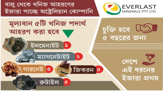 ইজারা-সংক্রান্ত কমিটির আহ্বায়ক, জ্বালানি ও খনিজসম্পদ বিভাগের অতিরিক্ত সচিব (অপারেশন) মোহাম্মদ জাকীর হোসেন কালবেলাকে বলেন, ‘নদীর বালু থেকে খনিজসম্পদ আহরণে অস্ট্রেলিয়ান কোম্পানির সঙ্গে আলোচনা চলছে। সামনে এ বিষয়ে আমাদের বৈঠক আছে।’