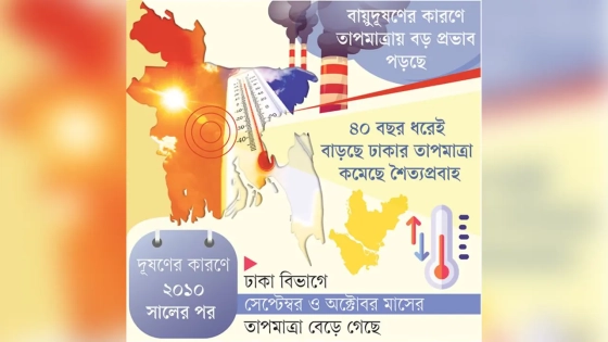 আবহাওয়াবিদ বজলুর রশীদ বলেন, ‘গরমে দেশের তাপমাত্রা বেড়ে যাচ্ছে। গরমের সময় বাড়ছে। অন্যদিকে, শীতের সময় কমেছে। শীতে দিনের তাপমাত্রা কমে যাচ্ছে। এতে করে মেঘ ও কুয়াশার পরিমাণও বাড়ছে। ২০১০ সালের পর ঢাকা বিভাগে সেপ্টেম্বর ও অক্টোবর মাসের তাপমাত্রা বেড়ে গেছে। এর একটা বড় কারণ দূষণ। ভবিষ্যতে এই তাপমাত্রা বাড়বে।’ তিনি বলেন, ‘বর্ষার সময় তাপমাত্রা বাড়ছে সারা দেশে। এখন অক্টোবর ও নভেম্বর মাসেও ভারি বৃষ্টি হচ্ছে। অর্থাৎ, বর্ষার সময় পরিবর্তন হয়েছে, বৃষ্টি দেরি করে আসছে এবং দেরি করে যাচ্ছে। প্রি মনসুন, মনসুন ও পোস্ট মনসুনের যে বিষয়, সেখানে দেখা যাচ্ছে পোস্ট মনসুনে বৃষ্টির পরিমাণ বাড়ছে।’