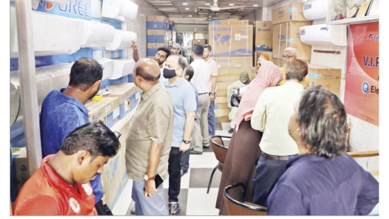 গতকাল সোমবার রাজধানীর গুলিস্তানের সুন্দরবন স্কয়ার সুপার মার্কেটের পাইকারি ইলেকট্রনিক পণ্যের দোকান, নবাবপুর রোডের পাইকারি ইলেকট্রনিক্স দোকান, বায়তুল মোকারম মার্কেটের ইলেকট্রনিক্স পণ্যের দোকানসহ বিভিন্ন ব্র্যান্ডের শোরুমগুলোয় ক্রেতার ভিড় ছিল চোখে পড়ার মতো। বেশিরভাগ ক্রেতাই সিলিং ফ্যান-স্ট্যান্ড ফ্যান ও এয়ারকুলার কিনছিলেন।