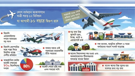 ইন্টারন্যাশনাল এয়ার ট্রান্সপোর্ট অ্যাসোসিয়েশন বা আয়াটার তথ্য অনুযায়ী, দেশে এখন গড়ে সাড়ে ১২ মিলিয়ন যাত্রী যাতায়াত করে, যা আগামী ১০ বছরে বেড়ে দাঁড়াবে মিলিয়নে। তবে এভিয়েশন খাতে প্রয়োজনীয় পদক্ষেপ নেওয়া না হলে দেশীয় এয়ারলাইন্সগুলোকে পেছনে ফেলে বিদেশি এয়ারলাইন্সগুলোই এর সুফল ঘরে তুলবে বলে মনে করছেন এভিয়েশন ব্যবসায়ী ও বিশেষজ্ঞরা।