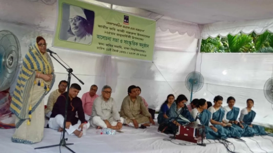 মানবতার পক্ষে জাতীয় কবির সৃষ্টিশীলতার কথা উল্লেখ করে তিনি বলেন, কাজী নজরুল ইসলাম সাম্যের কথা বারবার বলে গেছেন, মানবতার কথা বলেছেন। মানুষের অপমান, মানবতার অপমানের প্রতি তার লেখনিতে তিনি সবসময় ঘৃণা জানিয়েছেন। আজ পৃথিবীতে কত জাতিগত বিভেদ-লড়াই হচ্ছে। এই মুহূর্তে কাজী নজরুল ইসলামের মতো নির্ভীক ও সাহসী একজন মানুষকে আমাদের ভীষণ প্রয়োজন। আমাদের স্বাধীন দেশে মানুষকে সঠিক দিক দেখাবার জন্য আমাদের বারবার কাজী নজরুল ইসলামের দিকে ফিরে যেতে হবে। কাজী নজরুল ইসলামের সাহিত্য সৃষ্টির সময়ের ব্যপ্তি ছিল মাত্র ২৩ বছর। এর মধ্যে তিনি ১১ বছর সংগীত সৃষ্টি করেছেন। সেই সংগীতে মেহনতী মানুষের গান থেকে শুরু করে ইসলামী গান, শ্যামা সংগীত অন্যতম, যা আমাদের আজও উজ্জীবিত করে।