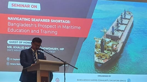 আজ শুক্রবার (১ সেপ্টেম্বর) সিঙ্গাপুরে বাংলাদেশ মেরিন কমিউনিটি, সিঙ্গাপুর (বিএমসিএস) আয়োজিত ‘নেভিগেটিং সিফেয়ারার শর্টেজ- বাংলাদেশে'স প্রসপেক্ট ইন মেরিটাইম এডুকেশন অ্যান্ড ট্রেনিং’ শীর্ষক সেমিনারে প্রধান অতিথির বক্তব্যে তিনি এসব কথা বলেন।