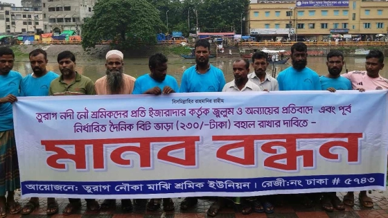 তুরাগ নৌকা মাঝি শ্রমিক ইউনিয়নের উদ্যোগে আব্দুল্লাহপুর আইচি হাসপাতাল ঘাটের বিট ভাড়া অস্বাভাবিক বৃদ্ধি, নৌকা চলাচল বন্ধ ও মাঝিদের হুমকি দেওয়ার প্রতিবাদে মাঝিদের মানববন্ধন অনুষ্ঠিত হয়েছে।