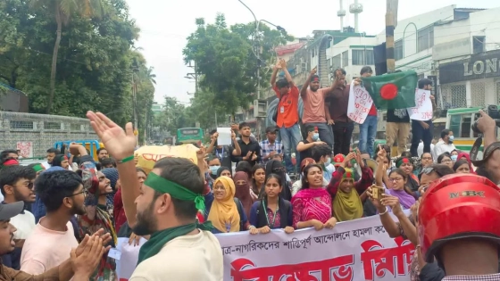 সরকারি চাকরিতে কোটা সংস্কার আন্দোলনের সহিংসতার ঘটনায় নিহতদের হত্যার বিচারসহ ৯ দফা দাবিতে সায়েন্স ল্যাব মোড়ে জড়ো হয়ে বিক্ষোভ করছে শিক্ষার্থীরা।