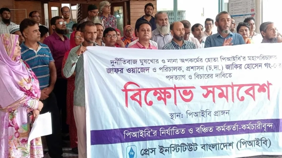প্রেস ইনস্টিটিউট বাংলাদেশের (পিআইবি) মহাপরিচালক জাফর ওয়াজেদের দুর্নীতির সহযোগী পরিচালক (প্রশাসন) জাকির হোসেনের অপসারণের দাবিতে বিক্ষোভ করেছে বৈষম্যের শিকার কর্মকর্তা- কর্মচারীরা। তাদের দাবি পিআইবির প্রভিড্যান্ট ফান্ডের অর্থ আত্মসাতের ঘটনা ঘটিয়েছে মহাপরিচালক জাফর ওয়াজেদ ও জাকির গং।