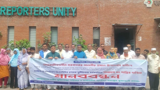 শনিবার (১৭ মে) দুপুরে রাজধানীর সেগুনবাগিচার ঢাকা রিপোর্টার্স ইউনিটির সামনে শহীদ মুক্তিযোদ্ধা পরিবার ও ভাষানটেক পুনর্বাসন প্রকল্পের ভুক্তভোগী জনতার উদ্যোগে এই মানববন্ধন অনুষ্ঠিত হয়।