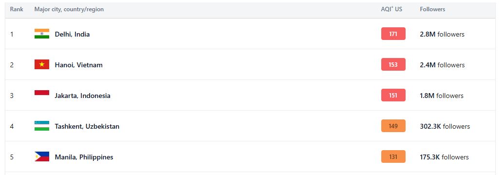 এদিন সকাল সাড়ে ৮টার দিকে ১৭১ স্কোর নিয়ে বিশ্বের দূষিত শহরের তালিকায় শীর্ষে রয়েছে ভারতের দিল্লি। এ ছাড়া ১৫৩ স্কোর নিয়ে দ্বিতীয় অবস্থানে রয়েছে ভিয়েতনামের হ্যানয় এবং ১৫১ স্কোর নিয়ে তৃতীয় অবস্থানে রয়েছে ইন্দোনেশিয়ার জাকার্তা।