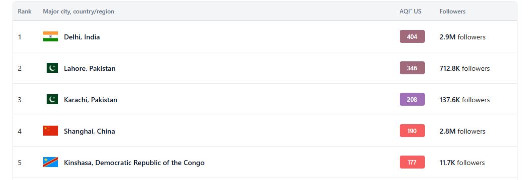 এদিন একই সময়ে ৪০৪ স্কোর নিয়ে বিশ্বের দূষিত শহরের তালিকায় শীর্ষে রয়েছে ভারতের দিল্লি শহর। এ ছাড়া ৩৪৬ স্কোর নিয়ে দ্বিতীয় অবস্থানে রয়েছে পাকিস্তানের লাহোর শহর, ২০৮ স্কোর নিয়ে তৃতীয় অবস্থানে রয়েছে দেশটির আরেক শহর করাচি। চতুর্থ অবস্থানে রয়েছে চীনের সাংহাই শহর, যার স্কোর ১৯০ এবং পঞ্চম অবস্থানে থাকা গণতান্ত্রিক কঙ্গো প্রজাতন্ত্রের রাজধানী কিনশাসার স্কোর ১৭৭।