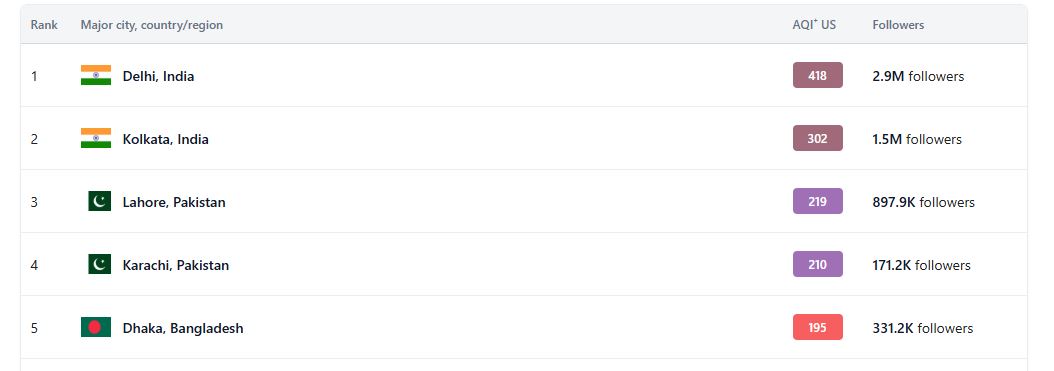 এদিকে একই সময়ে আর ২১৯ স্কোর নিয়ে তৃতীয় অবস্থানে রয়েছে পাকিস্তানের লাহোর এবং পঞ্চম অবস্থানে থাকা দেশটির আরেক শহর করাচির স্কোর ২১০।