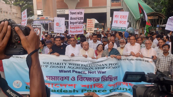 ফিলিস্তিনিদের ওপর ইসরায়েলি আগ্রাসন বন্ধ ও স্বাধীন ফিলিস্তিনের দাবিতে প্রতিবাদী সমাবেশ ও বিক্ষোভ মিছিল করেছে বাংলাদেশ শান্তি পরিষদ। গত বৃহস্পতিবার জাতীয় প্রেস ক্লাবের সামনে এসব কর্মসূচি পালিত হয়।