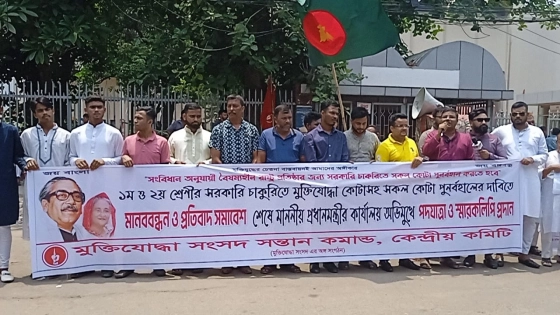 ১ম ও ২য় শ্রেণির সরকারি চাকরিতে মুক্তিযোদ্ধা কোটাসহ সব কোটা পুনর্বহালের দাবিতে মানববন্ধন ও প্রতিবাদ সমাবেশ করেছে মুক্তিযোদ্ধা সংসদ সন্তান কমান্ড।