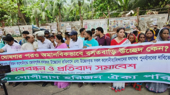 রেলমন্ত্রী নূরুল ইসলাম সুজনের পুনর্বাসনের আশ্বাসের পরও রাজধানীর ‘গোপীবাগ-টিটিপাড়া রেলওয়ে হরিজন কলোনি’তে বারবার উচ্ছেদ অভিযান পরিচালনার প্রতিবাদ জানিয়েছেন সেখানে বসবাসকারী লোকজন। সেইসঙ্গে দ্রুত সময়ের মধ্যে কলোনির সব বাসিন্দাকে সম্মানজনক পুনর্বাসনের দাবি জানিয়েছে গোপীবাগ হরিজন ঐক্য পরিষদ।