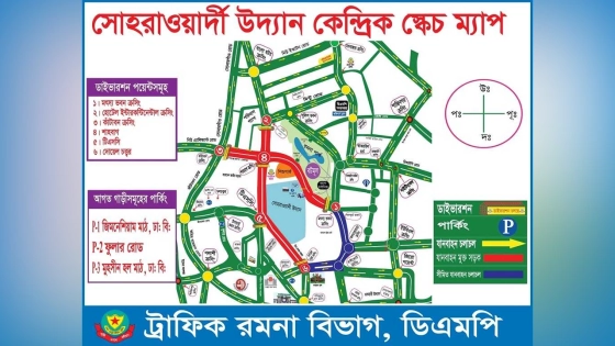 এর মধ্যে হোটেল ইন্টারকন্টিনেন্টাল ক্রসিং, শাহবাগ ক্রসিং, কাটাবন ক্রসিং, টিএসসি, দোয়েল চত্বর ও মৎস্য ভবন ক্রসিংয়ে যানবাহন চলাচল সীমিত রাখবে ডিএমপির ট্রাফিক-রমনা বিভাগ।