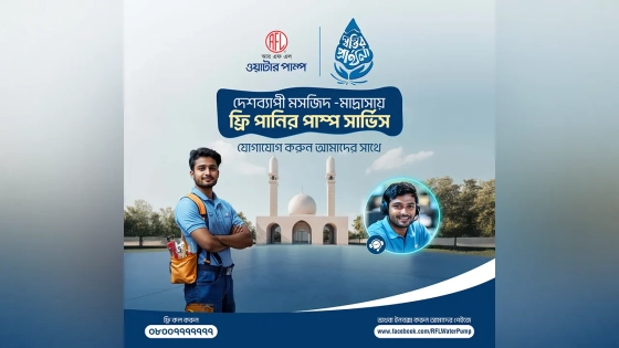 পবিত্র রমজান মাসে নির্বিঘ্নে ইবাদতের পরিবেশ নিশ্চিত করতে আরএফএল ওয়াটার পাম্প ‘স্বস্তির প্রার্থনা’ নামে বিশেষ ক্যাম্পেইন শুরু করেছে। এই ক্যাম্পেইনের আওতায় দেশব্যাপী মসজিদ ও মাদরাসায় বিনামূল্যে পানির পাম্প রিপেয়ার সার্ভিস করা হচ্ছে। গত ২ মার্চ থেকে শুরু হওয়া এ ক্যাম্পেইন চলবে ৩০ মার্চ পর্যন্ত।