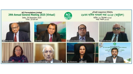 এসিআই ফর্মুলেশনস পিএলসি-এর ২৯তম বার্ষিক সাধারণ সভা (এজিএম) অনুষ্ঠিত হয়েছে। রোববার (২৮ ডিসেম্বর ২০২৫) সকাল ১০টায় ডিজিটাল প্ল্যাটফর্মে আয়োজিত এ সভায় সভাপতিত্ব করেন কোম্পানির সম্মানিত চেয়ারম্যান জনাব এম আনিস উদ দৌলা।
