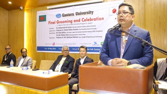 অনুষ্ঠানে প্রধান অতিথি ছিলেন ইস্টার্ন ইউনিভার্সিটির বোর্ড অব ট্রাস্টিজের চেয়ারম্যান মোহাম্মদ আলী আজ্জম। বক্তব্য রাখেন উপাচার্য অধ্যাপক ড. সহিদ আকতার হুসাইন, জাইকা এক্সপার্ট শোজি আকিহিরো এবং সামাইরা গ্রুপের এমডি মো. রফিকুল ইসলাম, ডিন প্রফেসর ড. মাহফুজুর রহমান, সহকারী অধ্যাপক মো. ইফতেখার মাহমুদ। প্রধান অতিথির বক্তব্যে আলী আজ্জম বলেন, আমরা আমাদের শিক্ষার্থীদের জন্য অত্যন্ত গর্বিত যারা জাপানের এই মর্যাদাপূর্ণ ফুললি-ফান্ডেড ইন্টার্নশিপ করার সুযোগ পেয়েছে। এই অর্জন তাদের কঠোর পরিশ্রম, দৃঢ়তা এবং ইস্টার্ন ইউনিভার্সিটিতে প্রদত্ত শিক্ষার ব্যতিক্রমী মানের একটি প্রমাণ।