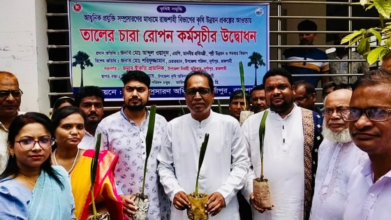 রোববার (১৪ জুলাই) রাজশাহীর দুর্গাপুর উপজেলা পরিষদ চত্বরে তালের চারা রোপণ কর্মসূচির উদ্বোধনীতে প্রধান অতিথির বক্তব্যে তিনি এসব কথা বলেন। কৃষি সম্প্রসারণ অধিদপ্তর কর্তৃক আয়োজিত আধুনিক প্রযুক্তি সম্প্রসারণের মাধ্যমে রাজশাহী বিভাগের কৃষি উন্নয়ন প্রকল্পের আওতায় এ তালের চারা রোপণ কর্মসূচির আয়োজন করা হয়।