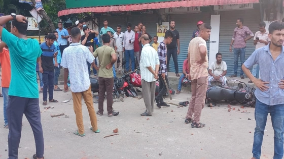 একপর্যায়ে আন্দোলনকারীরা শহরের থানা মোড় এলাকায় বঙ্গবন্ধু স্কয়ার সামনে অবস্থান নেয়। এ সময় ৩টি মোটরসাইকেল ভাঙচুরের ঘটনা ঘটে। পরে পুলিশ একজন আন্দোলনকারীকে আটক করলে পরিস্থিতি অশান্ত হয়ে ওঠে এবং তা সংঘর্ষে রূপ নেয় হয়। এ সময় পুলিশ শতাধিক টেয়ারশেল ও সাউন্ড গ্রেনেড ছুড়ে।