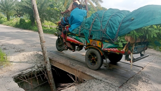 সরেজমিন দেখা যায়, কালভার্টটির দুই পাশে ধসে গিয়ে বড় বড় দুটি গর্ত হয়েছে। মাঝখানেও ভেঙে যাওয়ায় প্লেনশিট দিয়ে কোনোরকম যাতায়াতের ব্যবস্থা করা হয়েছে। জীবনের ঝুঁকি নিয়ে কালভার্টটির মাঝখান দিয়েই বাস, ট্রাকসহ ভারী যানবাহন চলাচল করছে।
