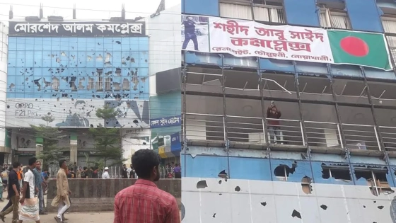 মঙ্গলবার (৬ আগস্ট) নোয়াখালীর চৌমুহনী মোরশেদ আলম কমপ্লেক্সে গিয়ে দেখা গেছে, গত কয়েকদিনের আন্দোলন ঘিরে আন্দোলনকারীদের সঙ্গে আওয়ামী লীগ ও ছাত্রলীগের সংঘর্ষে মার্কেটটি হামলার শিকার হয়। ভবনটির সামনের অংশের গ্লাস ও বিভিন্ন অবকাঠামোতে ভাঙচুর করা হয়।