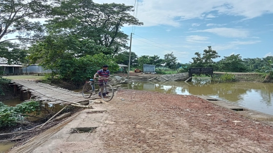 সরেজমিন দেখা গেছে, সড়কের বিভিন্ন জায়গায় ইটের খোয়া উঠে গেছে। পাহাড়ি ঢলে পানির স্রোতে ভেঙে গেছে সড়ক। অনেক জায়গায় সৃষ্টি হয়েছে বড় বড় গর্তের। গর্তের পাশে স্থানীয়দের তৈরি বাঁশের চাটার ওপর দিয়ে পারাপার হচ্ছে মানুষ।