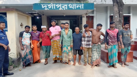 দুর্গাপুর থানার ওসি খাইরুল ইসলাম কালবেলাকে বলেন, পুকুর থেকে মাছ চুরির সময় আন্তঃজেলা চোর চক্রের ১০ সদস্যকে আটক করা হয়েছে। থানায় মামলা হয়েছে। তাদের আদালতের মাধ্যমে জেলহাজতে পাঠানো হয়েছে।