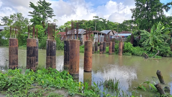 গতকাল বৃহস্পতিবার সরেজমিন দেখা গেছে, সেতুটি দৃশ্যমানই হয়নি। সেতু নির্মাণস্থলে কাজ আংশিক শেষ হয়ে পিলারের কতগুলো রড দাঁড়িয়ে আছে। পরবর্তী কাজের জন্য ঠিকাদারের কোনো মালপত্র সেখানে নেই। নেই কাজের কোনো সাইনবোর্ডও। পূর্ব পাশ দিয়ে যে বিকল্প সাঁকো করা হয়েছে চলাচলের জন্য, সেটিও অনেক ঝুঁকিপূর্ণ। নির্মাণস্থলে কোনো শ্রমিককেও পাওয়া যায়নি।