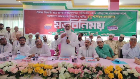 নরসিংদী জেলা জামায়াতের আমির মাওলানা মোসলেহ উদ্দিনের সভাপতিত্বে মতবিনিময় সভায় আরও উপস্থিত ছিলেন- নারায়ণগঞ্জ মহানগর আমির মাওলানা আব্দুল জব্বার, কেন্দ্রীয় নির্বাহী সদস্য সাইফুল আলম খান মিলন, জেলা সহকারী সেক্রেটারি অধ্যাপক মকবুল হোসেন, জেলা সহকারী সেক্রেটারি মাওলানা জাহাঙ্গাীর আলম, জেলা ছাত্রশিবির সভাপতি তাওহীদুল ইসলাম, শহর ছাত্রশিবির সভাপতি রুহুল আমিন।