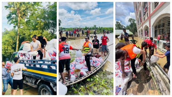 ভয়াবহ বন্যা পরিস্থিতিতে দুর্গত বানভাসী মানুষের পাশে দাঁড়িয়েছেন ঢাকা হাতিরপুল থেকে আন্নাফি ইসলাম শ্রেষ্ঠর উদ্যোগে মোসাহেব, রবিন ও আপন ৪ বন্ধু। শনিবার (২৪ আগস্ট) নিজ উদ্যোগে ফেনি, কুমিল্লা ও চট্টগ্রামে তাদের নিয়ে যাওয়া ত্রাণ পৌঁছে দেন বানভাসী মানুষের মাঝে।