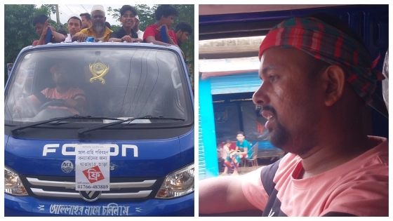 বন্যার পানিতে যখন সিএনজিচালিত অটোরিকশাসহ কাছাকাছি দূরত্বের চলাচল করা কঠিন হয়ে পড়েছে, ঠিক তখনই পিকআপভ্যানে বন্যায় আক্রান্ত যাত্রীদের বিনামূল্যে সেবা দিচ্ছেন নোয়াখালীর সোনাইমুড়ী উপজেলার পিকআপভ্যানচালক সাইফুল ইসলাম। তিনি ওমান থেকে বাড়ি এসে ১৫ লাখ টাকার পিকআপভ্যানটি কিস্তিতে কেনেন। এখন পর্যন্ত এর মাত্র একটি কিস্তি পরিশোধ করা হয়েছে।