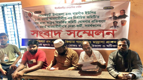 সংবাদ সম্মেলনে চলতি দায়িত্বে থাকা সভাপতি ইমন হোসেন ও সহসভাপতি মাস্টার মাফুজুর রহমান মানিক লিখিত বক্তব্যে বলেন, আওয়ামী লীগের গঠনতন্ত্র অনুযায়ী ২০২২ সালের ২৬ সেপ্টেম্বর উপজেলা আওয়ামী লীগ নেতৃবৃন্দের উপস্থিতিতে প্রত্যক্ষ ভোটে ১নং ওয়ার্ড আওয়ামী লীগ কমিটির সভাপতি ও সাধারণ সম্পাদক নির্বাচিত হন। এ ছাড়া অন্যান্য পদে উপস্থিত কাউন্সিলরদের মতামতের ভিত্তিতে পূর্ণাঙ্গ কমিটি গঠন ও ঘোষণা করা হয়। এরই মধ্যে ২০২৩ সালের ৬ জুন সভাপতি আবদুল মালেক মৃত্যুবরণ করেন। আবদুল মালেকের মৃত্যুতে গঠনতন্ত্র অনুযায়ী পরবর্তী মেয়াদকাল পর্যন্ত সিনিয়র সহসভাপতি ইমন হোসেন ইমন সভাপতির চলতি দায়িত্বে অধিষ্ঠিত হন। এতে তিনি দলীয় সব কার্যক্রমে অংশগ্রহণ ও নেতৃত্ব দিয়ে আসছেন। এ নিয়ে নেতাকর্মীদের কোনো বিরূপ প্রতিক্রিয়া নেই। কিন্তু গত ২০২৩ সালের ২৪ জুলাই গঠনতন্ত্র উপেক্ষা করে স্থানীয় আওয়ামী লীগ নেতাকর্মীদের অজান্তে বেল্লাল হোসেনকে সভাপতি ও চলমান কমিটির সাধারণ সম্পাদক সালেহ আহমদকে একই পদে পদায়ন করে আংশিক কমিটি ঘোষণা করে। আমরা এর প্রতিবাদ ও তীব্র নিন্দা জ্ঞাপন করি।