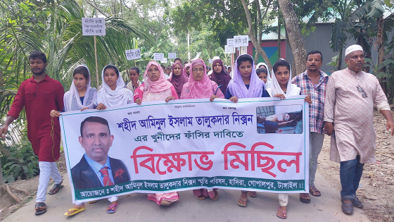 টাঙ্গাইলের গোপালপুরের আওয়ামী লীগ নেতা শহীদ আমিনুল ইসলাম তালুকদার নিক্সনের খুনিদের ফাঁসির দাবিতে বিক্ষোভ মিছিল করেছে এলাকাবাসী।