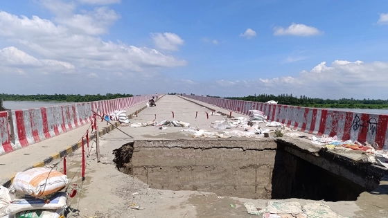 শনিবার (৩১ আগস্ট) বিকেলে সরেজমিনে দেখা যায়, সেতুর পশ্চিম অংশে সংযোগ সড়কের মাঝখানে তৈরি হয়েছে বিশাল গর্ত। স্থানীয় লোকজন স্বেচ্ছাশ্রমের ভিত্তিতে বালুভর্তি বস্তা ফেলেও সংযোগ সড়ক রক্ষা করতে পারেনি। একইসঙ্গে সেতুর পশ্চিম অংশের দুপাশের মাটি ও ব্লক সরে গিয়ে বড় গর্তের সৃষ্টি হওয়ায় ভাঙনের হুমকিতে পড়েছে সেতু। সেতুর একাধিক স্থানে ফাটলও দেখা গেছে।