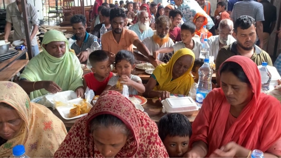 বিপদগ্রস্ত এসব মানুষের জন্য এভাবে মেজবানির আয়োজনে তারা খুব খুশি। দেখা যায়, সেখানে দুপুরের খাবার হিসেবে পরিবেশন করা হচ্ছে মুরগির মাংস, ডাল ও সাদা ভাত। আয়োজকরা জানান, এক দিন মুরগি হলে অন্যদিন মাছের ব্যবস্থা করা হয়।