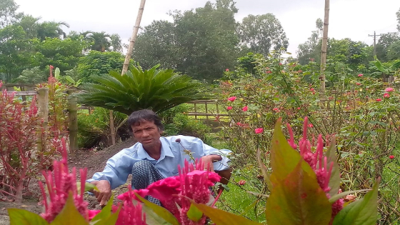 কঠোর পরিশ্রম ও একাগ্রতায় ২০ বছরে তিনি ৫ বিঘা জমিতে ফুল চাষ করে এখন স্বাবলম্বী। ওই বাগানে এখন শোভা পাচ্ছে রজনীগন্ধা, জারবেরা গোলাপ, গেন্ডারিয়া, ক্যানডুলার, গাচুবাম ট্রেটাজ, মন্ডিওঝাউ, চাইনিজ পাম্প, ললনি পাম্প, ময়ুরপঙ্কিরাজ কার্পেট ঘাসসহ নানা প্রজাতির মূল্যবান ফুল।