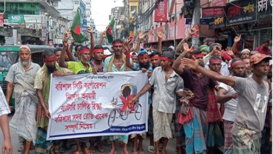 বরিশাল নগরীর সদর রোডে ব্যাটারিচালিত অবৈধ রিকশা চলাচল বন্ধের দাবিতে বিক্ষোভ মিছিল করেছে প্যাডেলচালিত রিকশাচালকরা। গতকাল রোববার দুপুরে নগরীর সদর রোডে এ বিক্ষোভ হয়। এ সময় রিকশাচালকরা তাদের আয়ের মাধ্যম সচল রাখতে সদর রোডে ব্যাটারিচালিত রিকশা বন্ধের দাবি তোলেন।