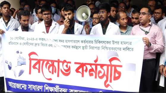 বৃহস্পতিবার (১২ সেপ্টেম্বর) হাসপাতালের বহির্বিভাগের সামনে তারা এ মানববন্ধন কর্মসূচি পালন করেন। এ সময় প্রাইভেট চেম্বারও বন্ধ রাখার আহ্বান জানান বক্তারা। পরে শিক্ষার্থীদের একটি মিছিল পুলিশ সুপার কার্যালয়ে গিয়ে বিক্ষোভ করে।