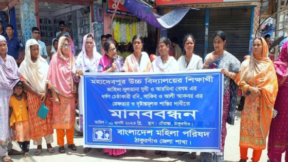 ঠাকুরগাঁও সদরের চিলারং ইউপির মাধবপুর উচ্চ বিদ্যালয়ের সপ্তম ও দশম শ্রেণির দুই শিক্ষার্থীকে ধর্ষণচেষ্টার ঘটনায় অভিযুক্তদের শাস্তির দাবিতে মানববন্ধন ও সমাবেশ করেছে বাংলাদেশ মহিলা পরিষদ।