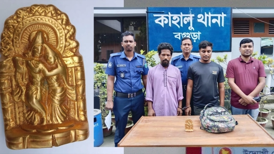 বগুড়ার কাহালুতে নকল সোনার মূর্তি দিয়ে প্রতারণার সময় হাতেনাতে দুই প্রতারক ধরা পড়েছে। মঙ্গলবার (১৭ সেপ্টেম্বর) সন্ধ্যার দিকে উপজেলার মহিষামুড়া থেকে তাদের গ্রেপ্তার করা হয়।